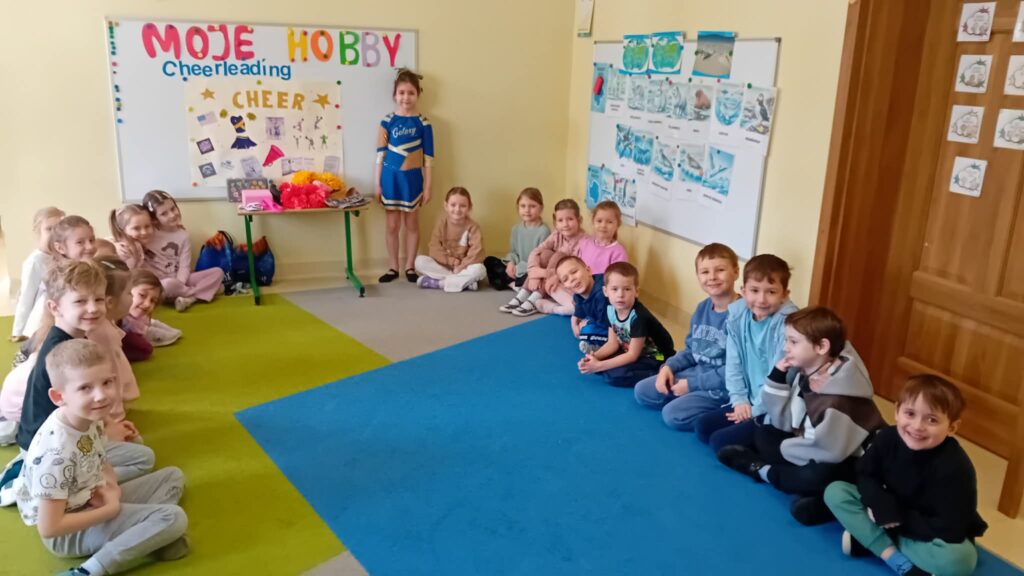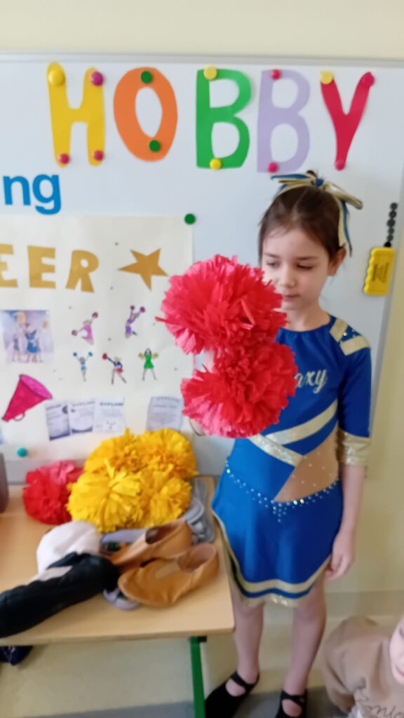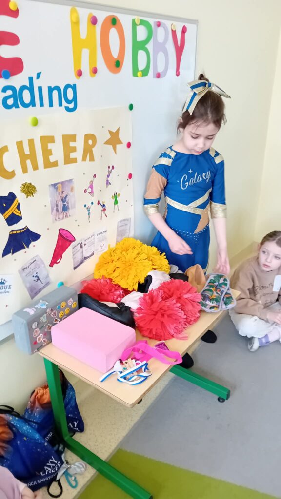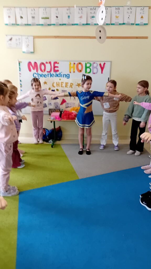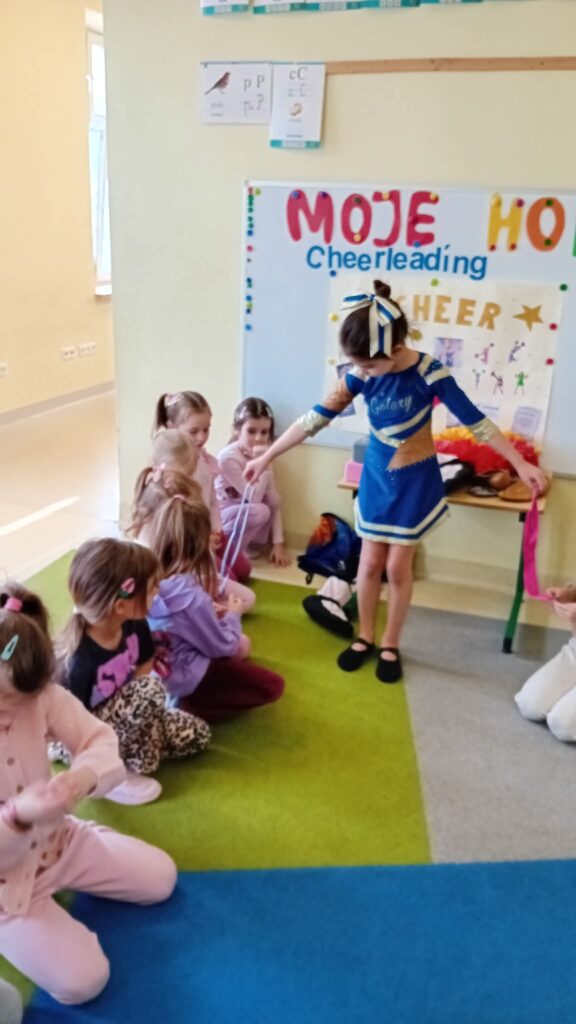 W grupie 5 rozpoczęliśmy realizację projektu edukacyjnego, w ramach którego dzieci prezentują swoje pasje i ulubione aktywności. Pierwsze zajęcia poprowadziła Antosia, która z ogromnym zaangażowaniem opowiedziała kolegom i koleżankom o swoim hobby – cheerleadingu.