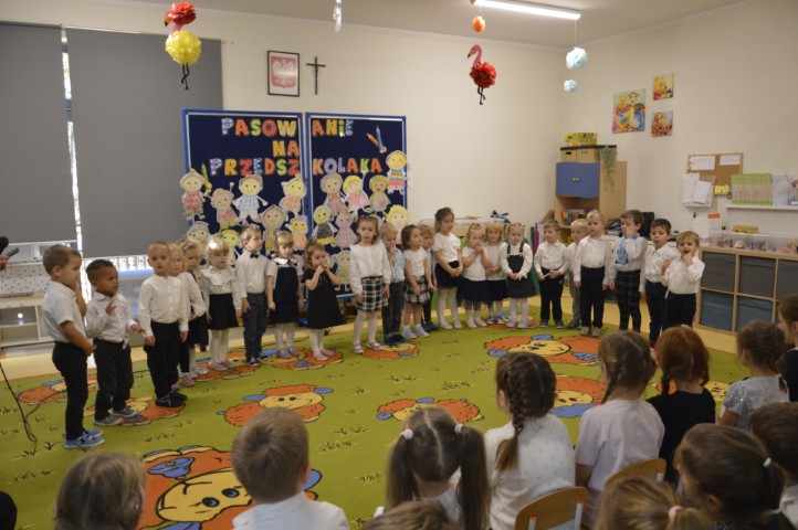 Uroczystość rozpoczęła się występem najmłodszych przedszkolaków. Dzieci z dumą zaprezentowały przygotowany program artystyczny – śpiewały piosenki, recytowały wierszyki i z uśmiechem tańczyły, pokazując jak wiele już potrafią.