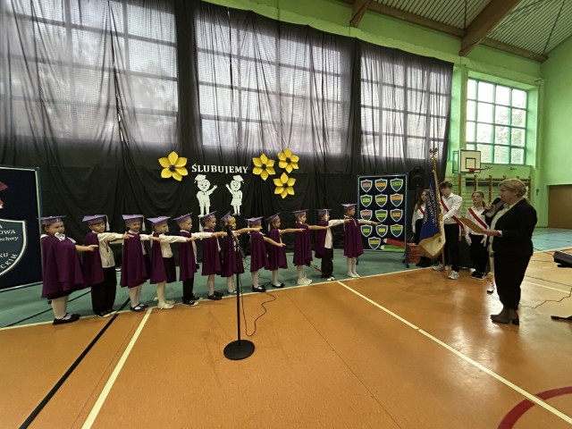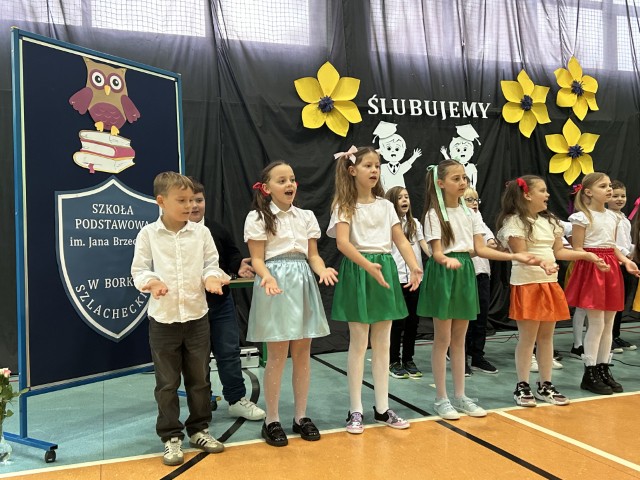 Akt ślubowania i pasowanie pierwszoklasistów na uczniów Szkoły Podstawowej w Borku Szlcheckim to podniosłe i ważne wydarzenie w życiu każdego „pierwszaka” i jego rodziców, a także w życiu szkoły. 22 pżdziernika o godzinie 9:00 na hali gimnastycznej, pięknie udekorowanej, miło miejsce to ważne wydarzenie. Uroczystość rozpoczęłli uczniowie klasy drugiej i trzeciej piosenkmi do słów Jana Brzechwy- patrona naszej szkoły, przy akompaniamancie pani Lidii Żmudy. Pierwszoklasiści w pięknych strojach zaprezentowali zaproszonym gościom i licznie przybyłym rodzicom wiedzę i umiejętności zdobyte w pierwszym miesiącu nauki. Z wielkim zaangażowaniem zaprezentowli bogaty program artystyczny. Następnie złożyli uroczyste przyrzeczenie. Ślubowali być dobrymi uczniami i Polakami, godnie reprezentować swoją szkołę i klasę, zachowaniem i nauką sprawiać radość rodzicom i nauczycielom. Po uroczystym ślubowaniu, aktu pasowania na ucznia dokonała dyrektor Małgorzata Więsek. Podczas ceremonii pierwszoklasiści zostali oficjalnie przyjęci do braci uczniowskiej. Na zakończenie uroczystości z rąk pani dyrektor, dzieci otrzymały dyplomy oraz legitymacje szkolne. Pamiątkowe upominki otrzymali od pani dyrektor i Samorządu Uczniowskiego. Rodzice przygotowali piękne życzenia oraz cudowne upominki. Zadbali również o poczęstunek. W imieniu uczniów klas pierwszych serdecznie dziękuję wszystkim osobom zaangażowanym w organizację uroczystości. Rodzicom, dyrekcji i zaproszonym gościom dziękujemy za przybycie i niespodzianki. Ten radosny dzień na długo pozostanie w pamięci nas wszystkich. Pierwszakom i całej społeczności uczniowskiej życzę pomyślnego i spokojnego roku szkolnego.