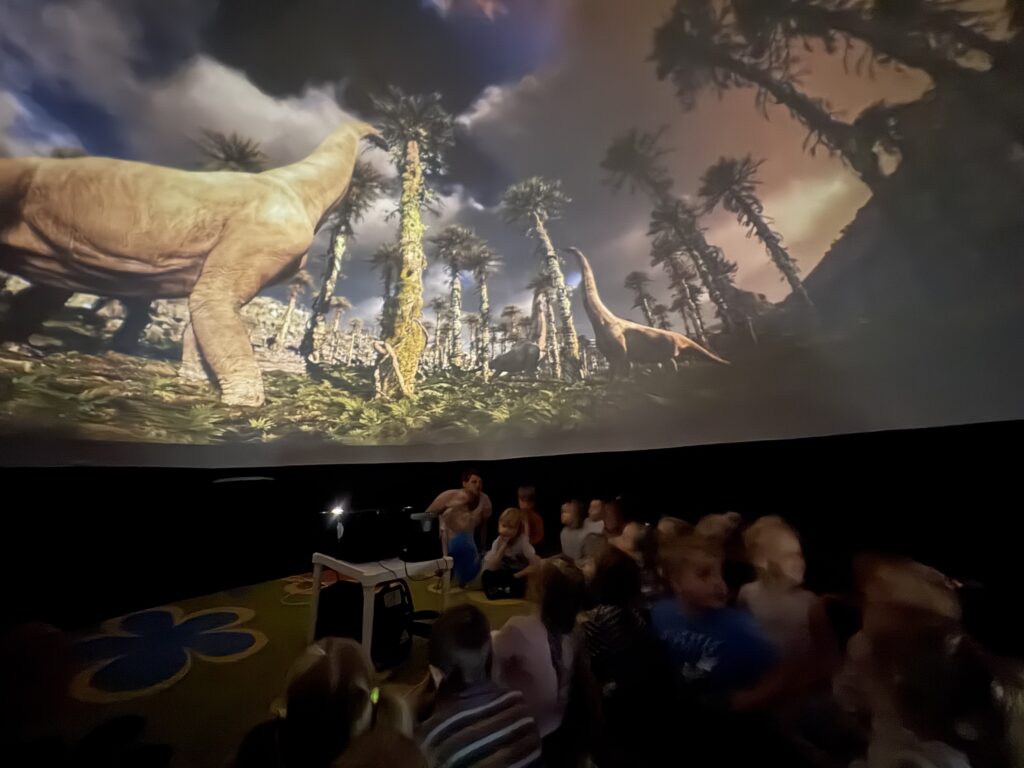 29 października w naszym przedszkolu mieliśmy wyjątkowego gościa – Planetarium Orbitek, które zabrało nas w niesamowity świat dinozaurów. Dzieci oglądały fascynujące filmy edukacyjne w specjalnym, nadmuchiwanym namiocie – tak zwanym „bąbelku”. Seans wzbudził ogromne emocje i wszystkim bardzo się podobał. Po pokazie przedszkolaki mogły dotknąć modelu dinozaura oraz zrobić sobie pamiątkowe zdjęcie. To było pełne wrażeń i radości spotkanie, które na długo pozostanie w naszej pamięci.