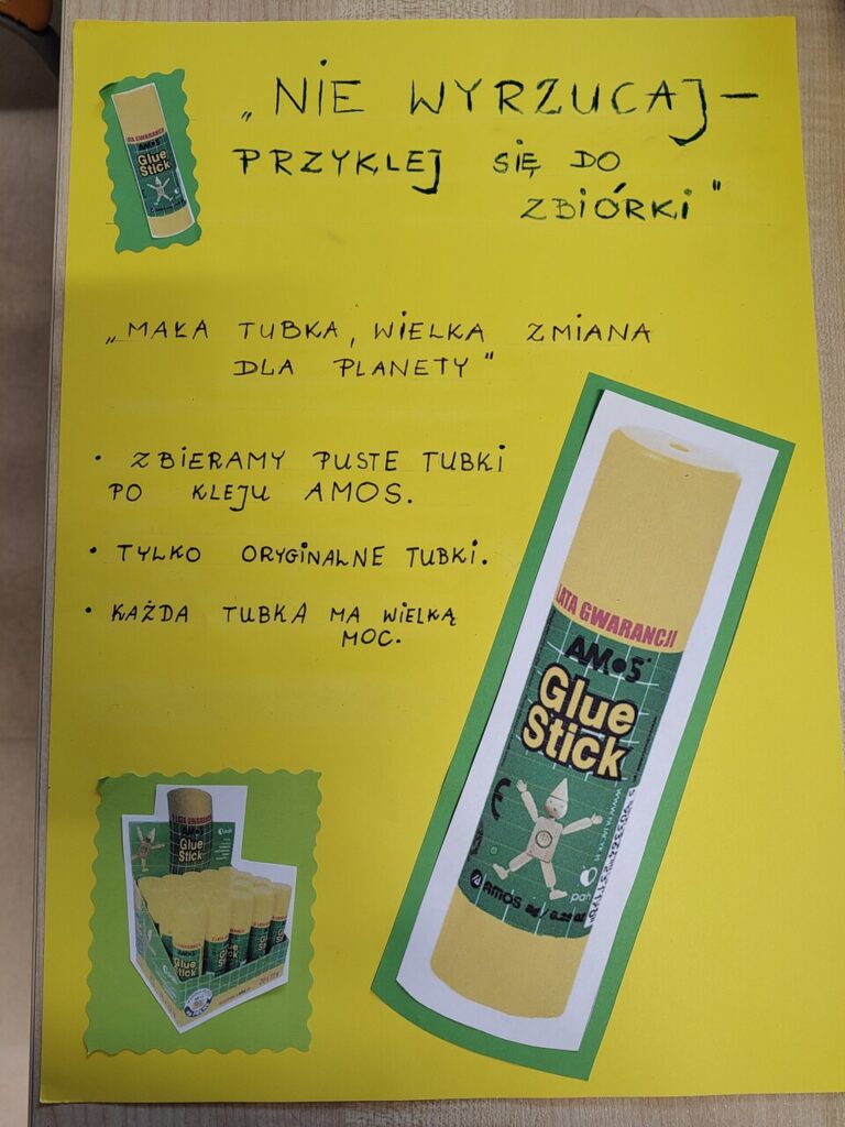 W ramach Wolontariatu Nasza Szkoła bierze udział w akcji zbiórki pustych tubek po kleju firmy AMOS.