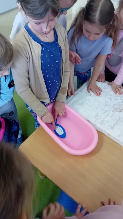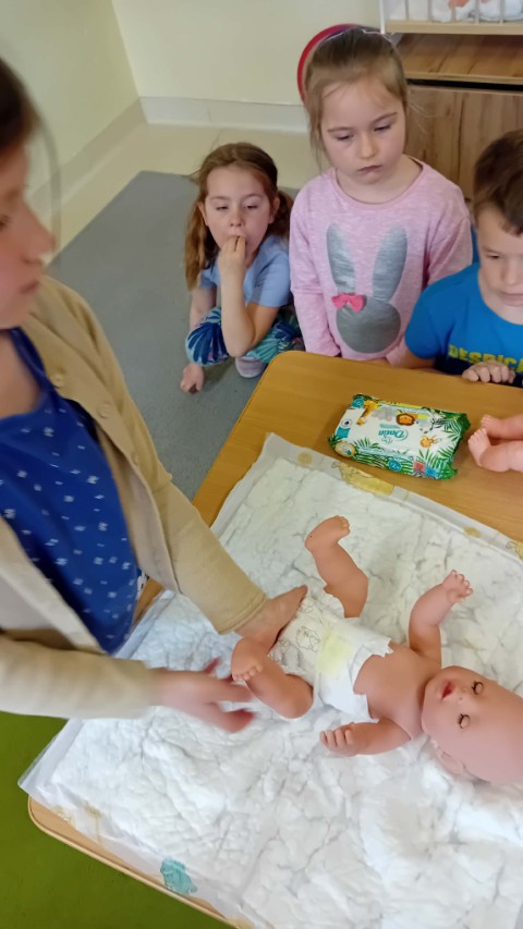 Podczas zajęć opowiedziała także, jak dawniej zajmowano się maluchami w specjalnych ochronkach. Wyjaśniła, że dziecko po narodzinach wymaga szczególnej opieki. Przedstawiła akcesoria potrzebne do opieki nad niemowlęciem oraz pokazała, jak należy przewijać, karmić i kąpać dziecko.