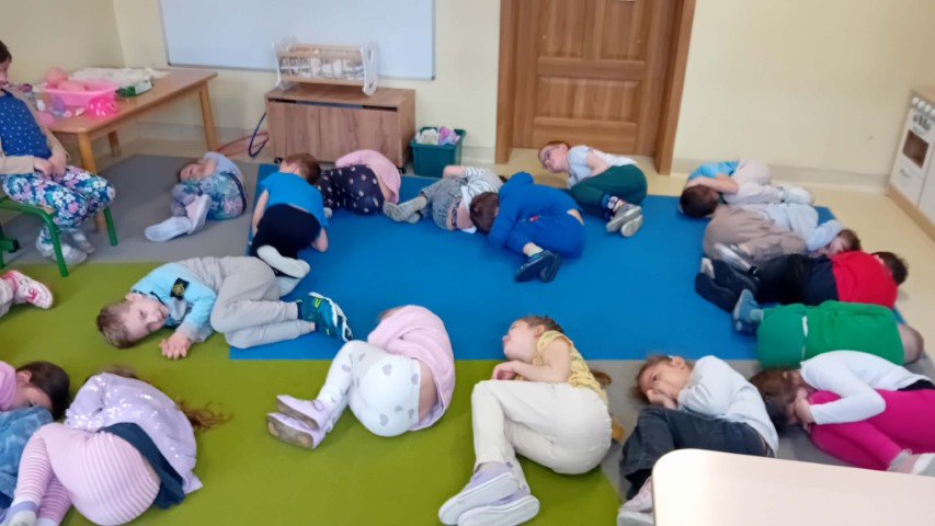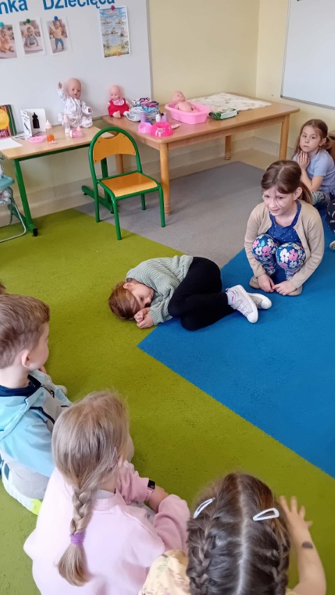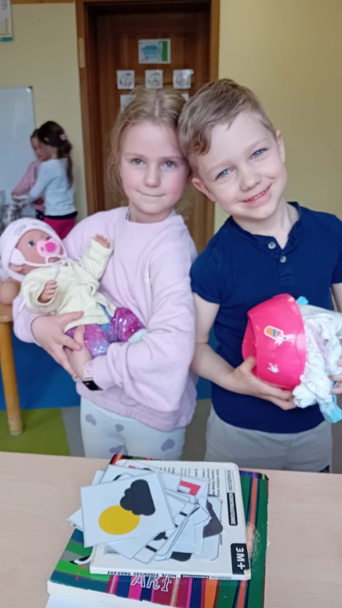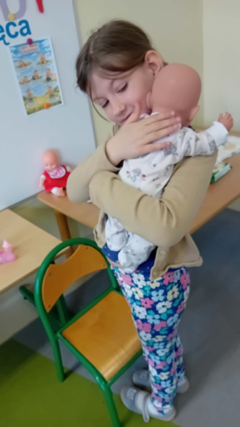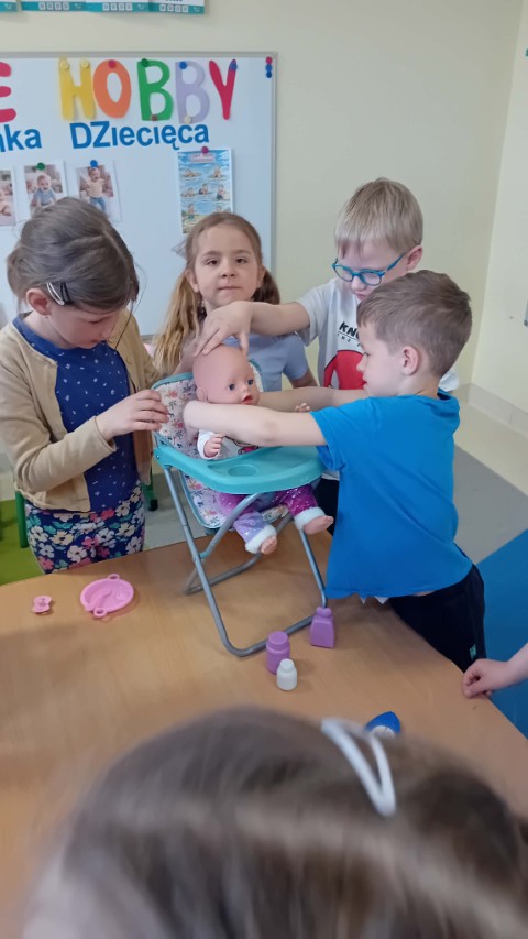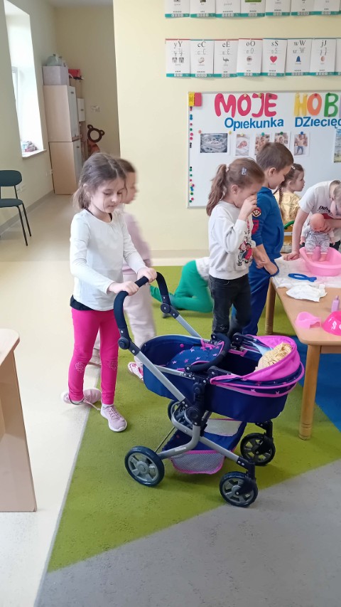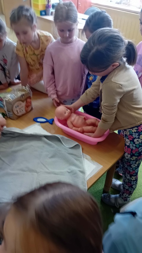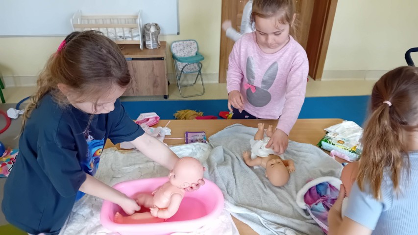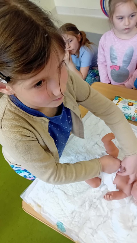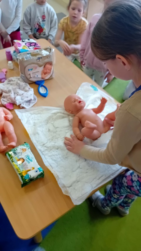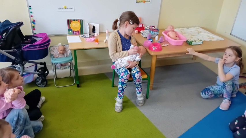 Nie zabrakło także części praktycznej. Sala była podzielona na kilka stanowisk, na których dzieci mogły ćwiczyć różne czynności na lalkach, takie jak przebieranie, karmienie, kąpanie czy noszenie w nosidełkach oraz spacerowanie z „dzieckiem”.