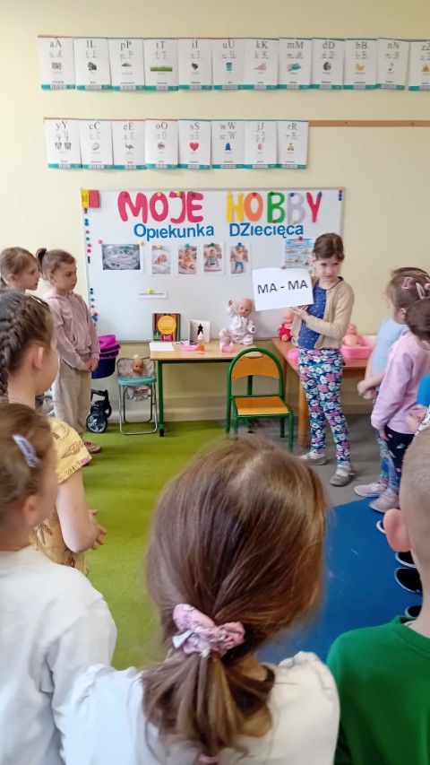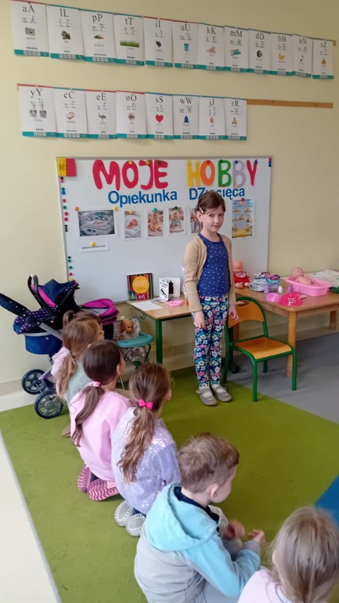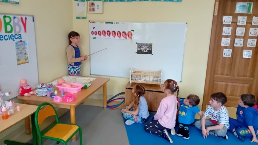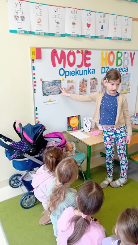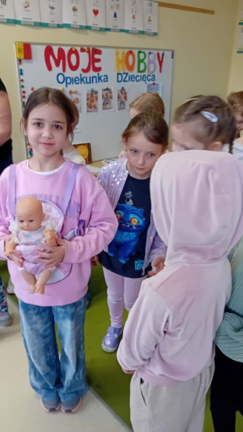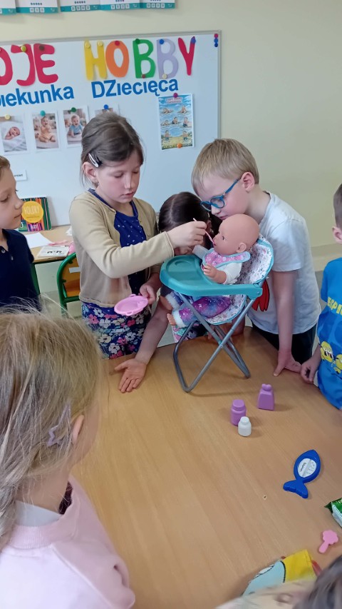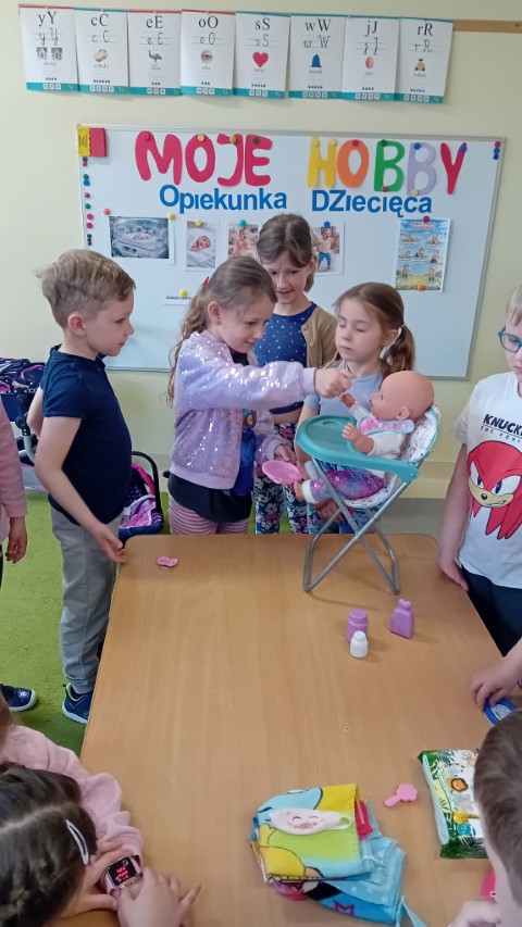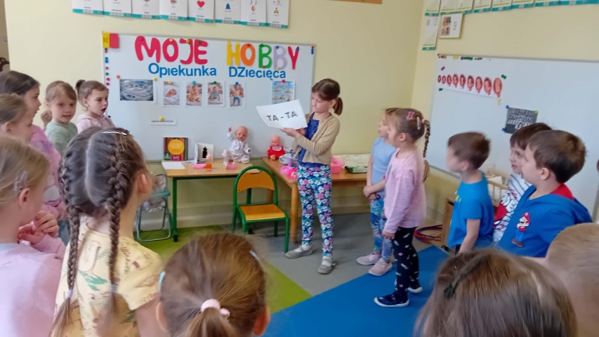 Kolejne zajęcia z projektu „Zainteresowania Rozwijają” dotyczyły opieki nad małymi dziećmi. Przedszkolaki poznały zawód opiekunki dziecięcej. Dziewczynka prowadząca zajęcia opowiedziała, dlaczego lubi opiekować się dziećmi – mówiła, że jest jej przykro, gdy małe dzieci są nieszczęśliwe albo chore i to właśnie zainspirowało ją do tego, aby w przyszłości pomagać i opiekować się najmłodszymi.