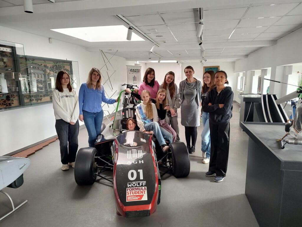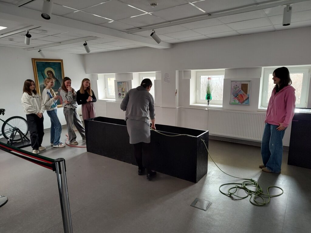 Kolejnym punktem wycieczki było odwiedzenie wystawy „Patrzę, Słucham, Eksperymentuję”, gdzie uczennice miały okazję samodzielnie wykonać eksperymenty oraz poznać fizykę w życiu codziennym.