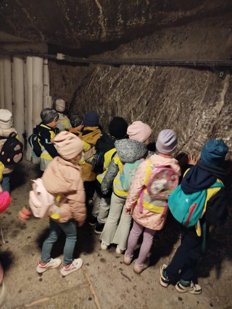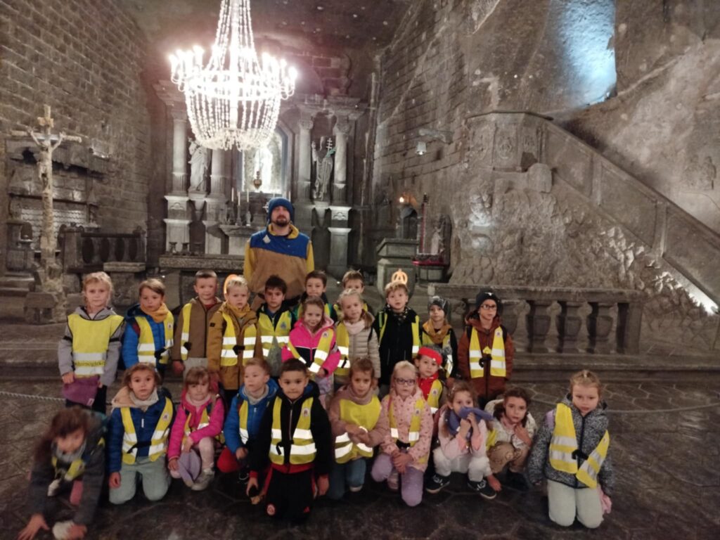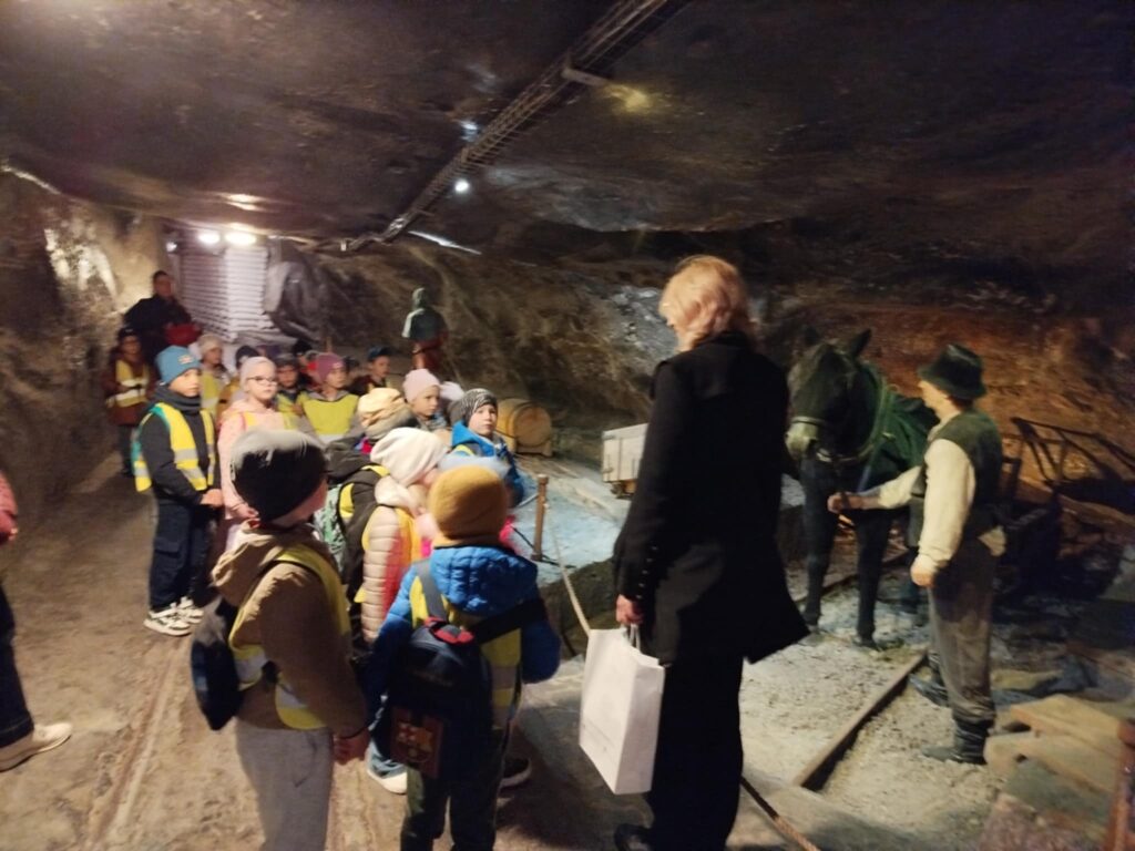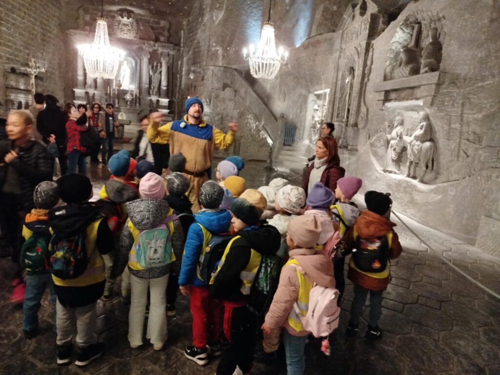 Dnia 22.10.2025 grupa VI wybrała się na wycieczkę do Kopalni Soli w Wieliczce. Na początku spotkaliśmy się z panią przewodnik, która zaprosiła nas do wspólnej podziemnej przygody. Podążaliśmy za wskazówkami ukrytymi w kopalni, które prowadziły nas coraz głębiej w solne korytarze. Po drodze natrafiliśmy na Soli Ludka – wesołego mieszkańca kopalni, który przejął od pani przewodnik rolę naszego przewodnika i opowiedział nam wiele ciekawostek o życiu pod ziemią. Zobaczyliśmy piękne solne rzeźby, kaplice wykute w soli, błyszczące kryształki soli na ścianach. Na końcu naszej wyprawy dotarliśmy do Skarbnika, strażnika kopalni, który przywitał nas serdecznie i pochwalił za to, że tak dzielnie rozwiązaliśmy wszystkie zagadki. To była magiczna podróż do solnego świata, pełna wrażeń, uśmiechów i nowych odkryć.