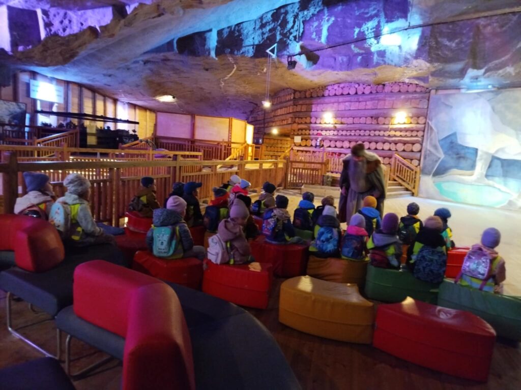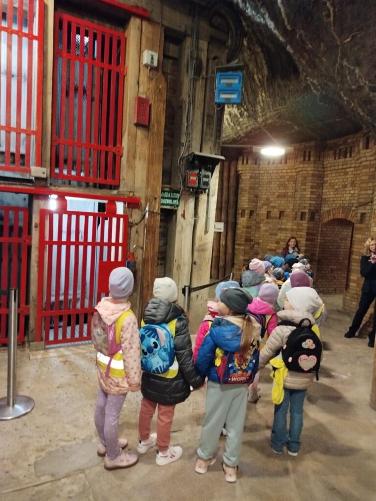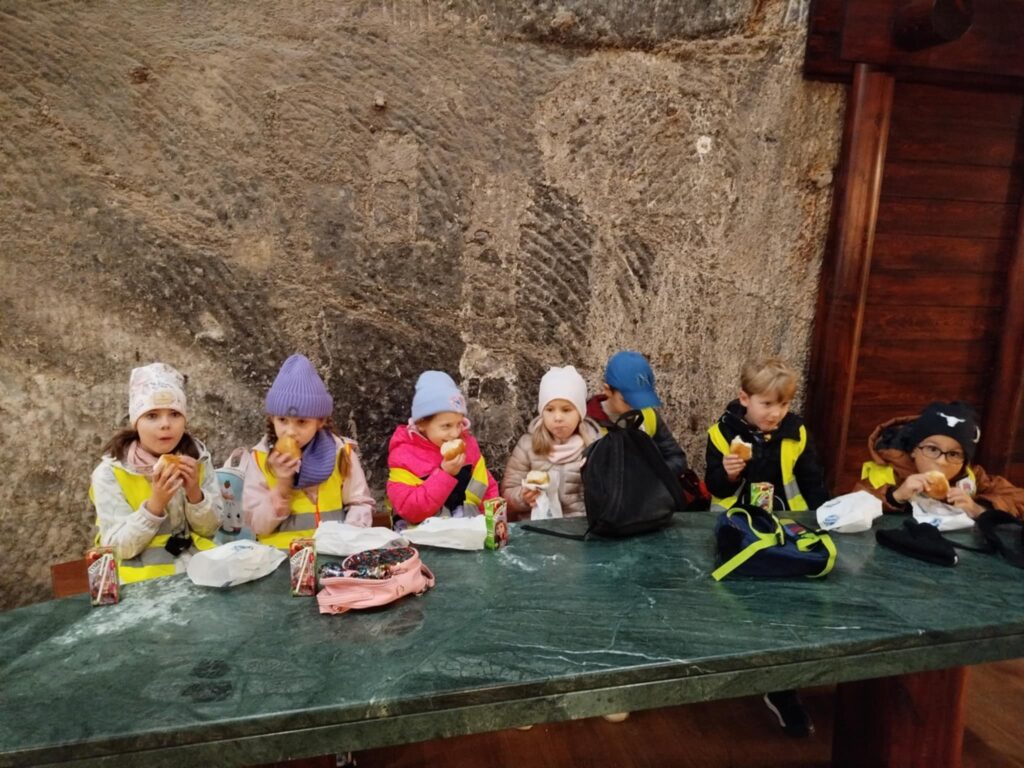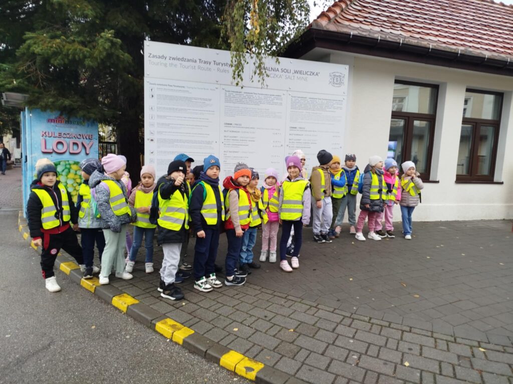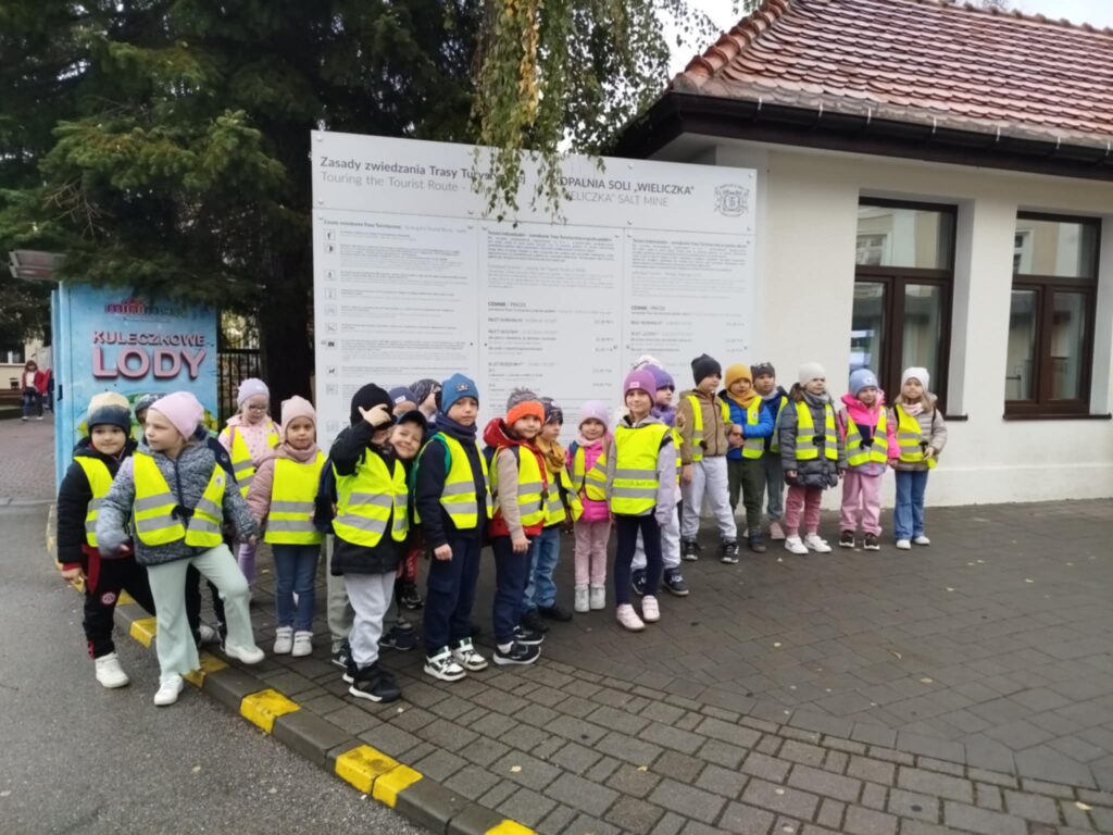Dnia 22.10.2025 grupa VI wybrała się na wycieczkę do Kopalni Soli w Wieliczce. Na początku spotkaliśmy się z panią przewodnik, która zaprosiła nas do wspólnej podziemnej przygody. Podążaliśmy za wskazówkami ukrytymi w kopalni, które prowadziły nas coraz głębiej w solne korytarze. Po drodze natrafiliśmy na Soli Ludka – wesołego mieszkańca kopalni, który przejął od pani przewodnik rolę naszego przewodnika i opowiedział nam wiele ciekawostek o życiu pod ziemią. Zobaczyliśmy piękne solne rzeźby, kaplice wykute w soli, błyszczące kryształki soli na ścianach. Na końcu naszej wyprawy dotarliśmy do Skarbnika, strażnika kopalni, który przywitał nas serdecznie i pochwalił za to, że tak dzielnie rozwiązaliśmy wszystkie zagadki. To była magiczna podróż do solnego świata, pełna wrażeń, uśmiechów i nowych odkryć.